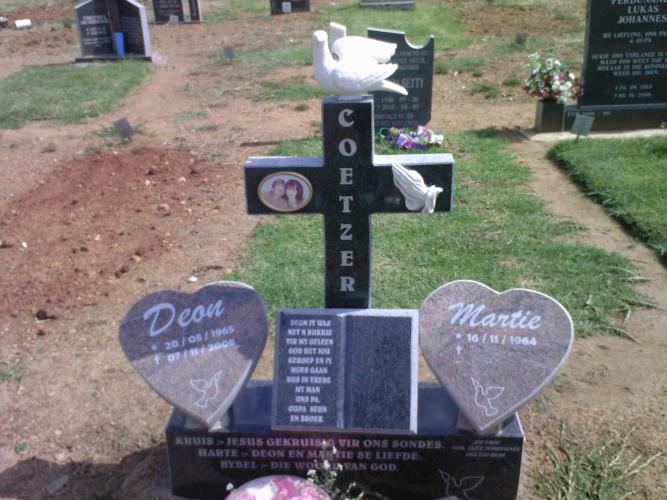 My hartjie is so seer waar ek nou sit om jou briefie te skryf,en weet jy ek dink nou dat miskien moes ek eerder toe ek die kans gehad het,vir jou gese het wat jy vir my beteken,maar dan het ek my troos in Jesus,en weet ek dat ons net jou liggaam tot rus gaan le, jy my boetie lewe en jy sal vir altyd lewe want jy is n Koningskind en jy het die ewige lewe be-erwe. as ek na die foto van jou kyk dan dink ek:"weet jy die Here het toe jy die aardse lewe gelaat gelaat het,het hy so met jou in die paradys gaan brek en vir almal gaan se, kyk hier is hy dis My seun Deon Coetzer dis My Deon." Al is dit vir ons swaar weet ek dat hierdie net n tydelike skeiding is, en dat ek jou weer sal sien binnekort as die Here ons kom haal.Ek troos my dat jy my boetie saam Jesus is en dat jy geen pyn,hartseer of swaar kry ooit weersal hoef te dra nie. So my soen op jou voorkop nou die aand was sommer my "baai" tot ek jou weer sien, love you lots en mis jou al klaar. Liefde jou klein sussie Antoinette of soos jy sou se Anna.